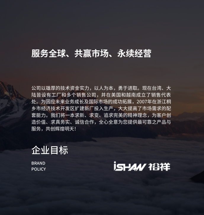 服務全球、共贏市場、永續經營 公司以雄厚的技術資金實力,以人為本,勇于進取。現在臺灣、大陸皆設有工廠和多個銷售公司,并在美國和越南成立了銷售代表處。為因應未來業務成長及國際市場的成功拓展,2007年在浙江桐鄉市經濟技術開發區擴建新廠投入生產,大大提高了市場需求的配套能力。我們將一本求新、求變、追求完美的精神理念,為客戶創造價值、求真務實、誠信合作,全心全意為您提供最可靠之產品與服務,共創輝煌明天! 企業目標 BRAND POLICY